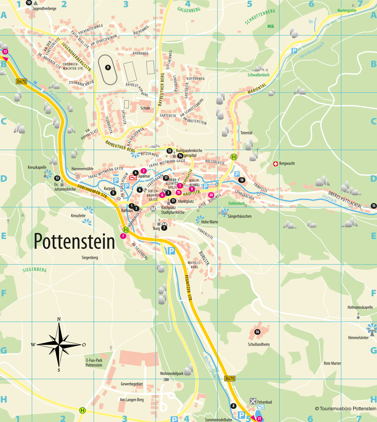 Anhand der schwarzen Ziffernpunkte und Planquadratbezeichnungen finden Sie im Stadtplan schnell alle oben genannten Einrichtungen!