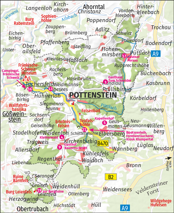 Felsenstädtchen (1500 Einw.) am Zusammenfluss von Püttlach, Weihersbach und Haselbrunnbach, inmitten steil aufragender Dolomitfelsen gelegen, herrliche Mischwälder, forellenreiche Bäche, Mühlen und Höhlen, mit den ebenso staatlich anerkannten Luftkurorten Tüchersfeld, Kirchenbirkig/Weidenloh, Haselbrunn und weiteren Ortsteilen Rackersberg, Kleinlesau, Weidmannsgesees, Hohenmirsberg, Steifling, Haßlach, Prüllsbirkig, Vorderkleebach, Püttlach, Siegmannsbrunn, Elbersberg, Wannberg, Schüttersmühle, Waidach, Regenthal, Leienfels, Weidenhüll und Graisch.